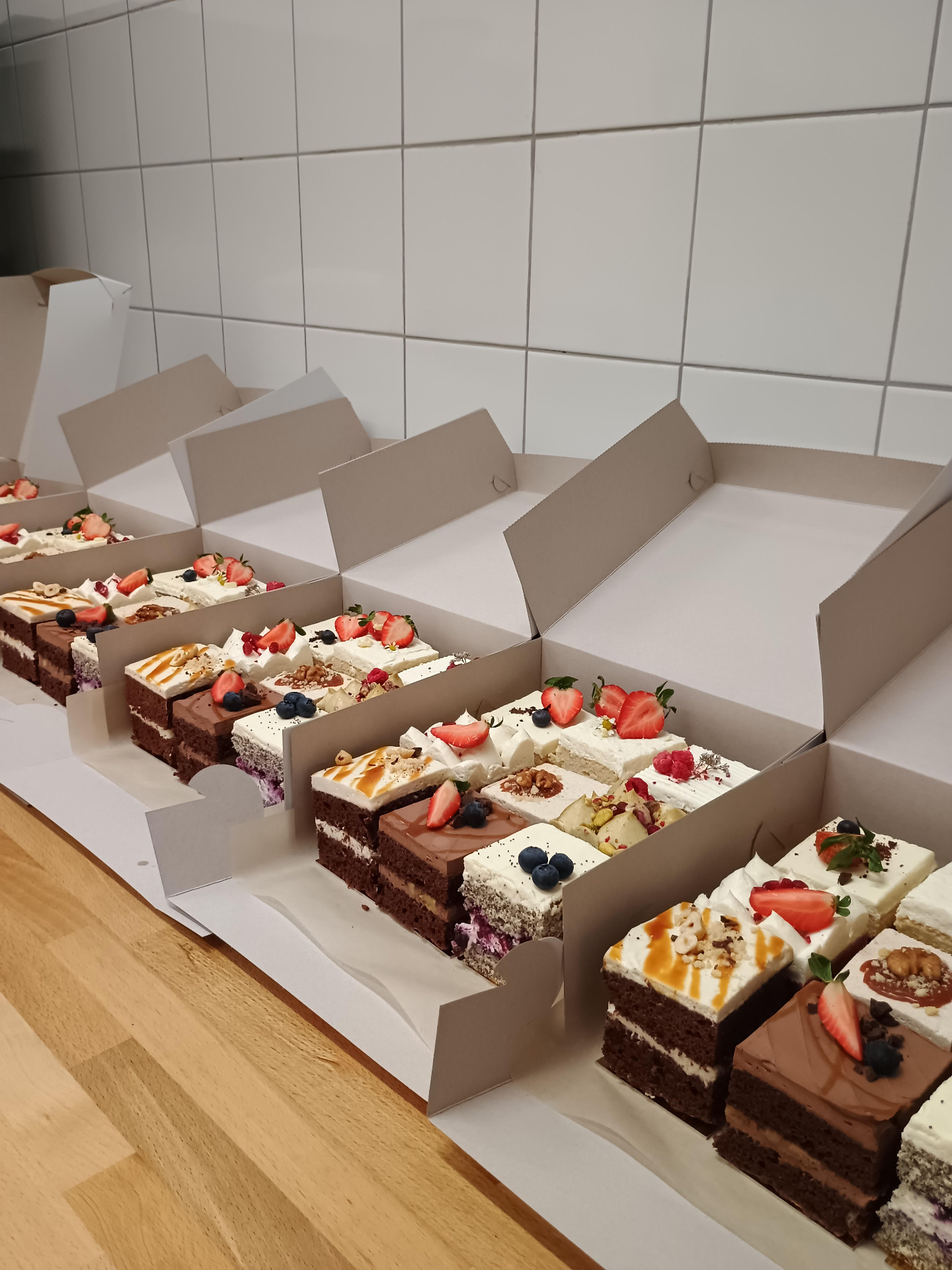 Každá příchuť je v krabičce zastoupena jedním čtvercovým řezem dortu.