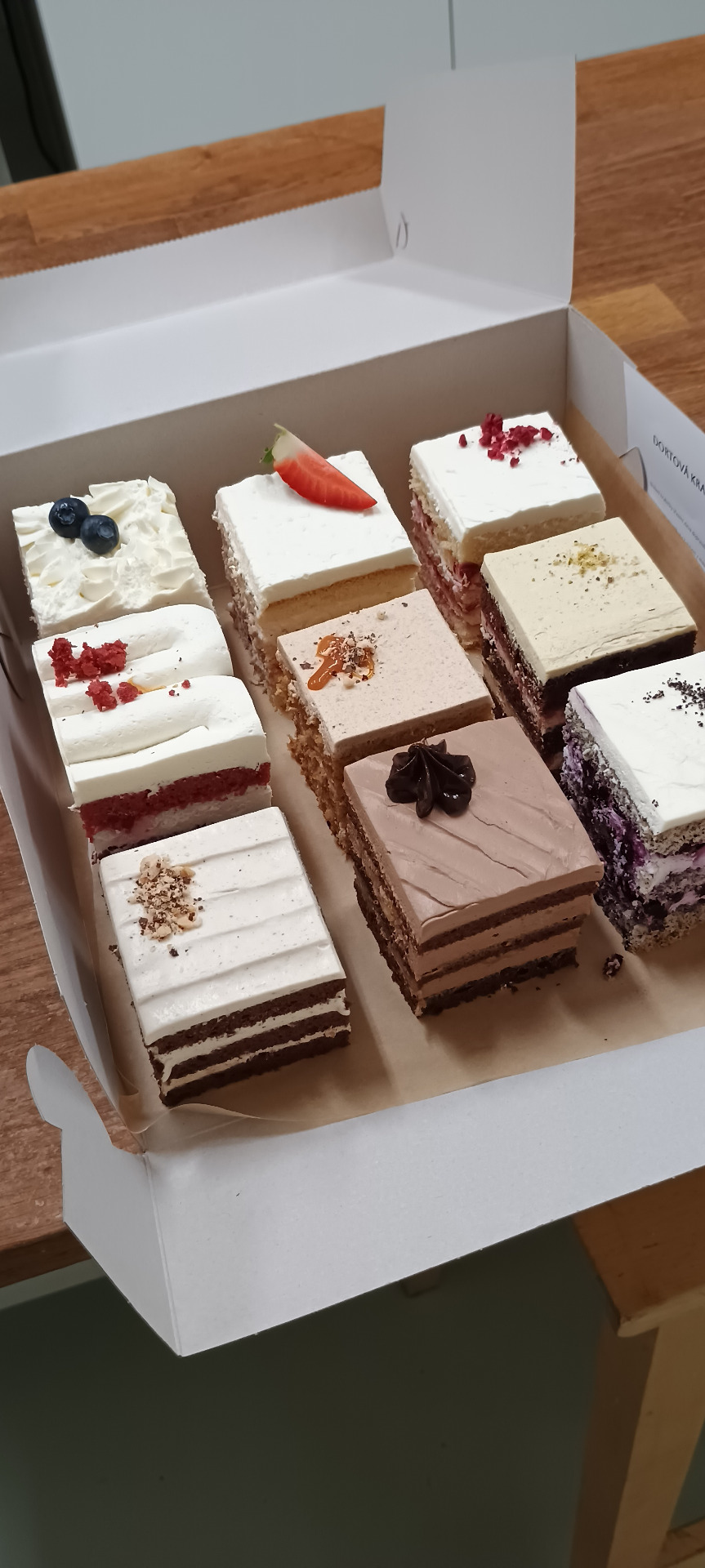 Každá příchuť je v krabičce zastoupena jedním čtvercovým řezem dortu.